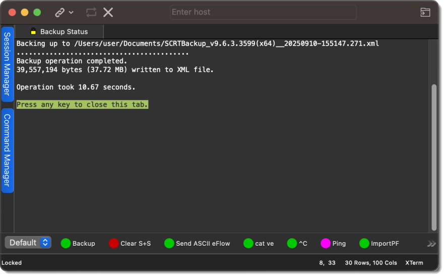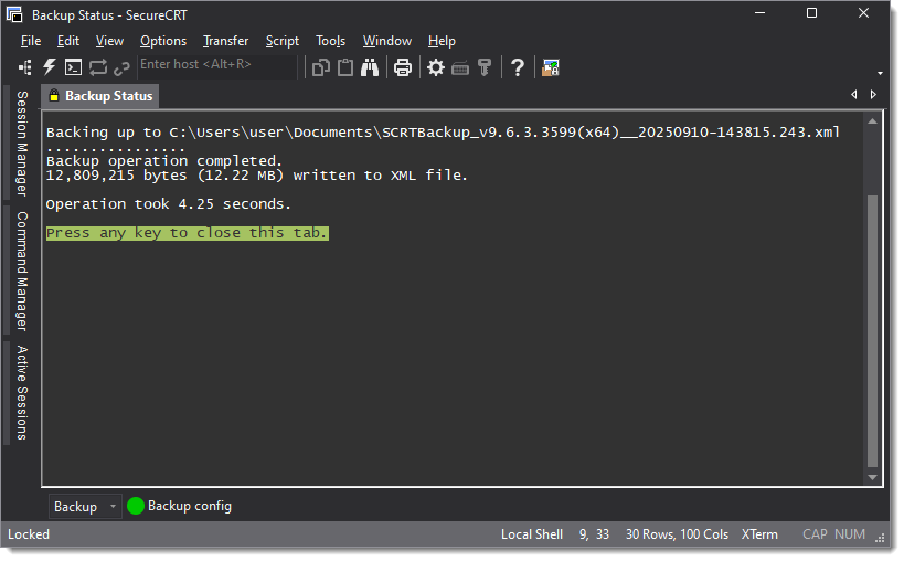 A backup of SecureCRT's configuration can be created by means of the Tools/Export Settings... mechanism. With this example script, you can map a button on SecureCRT's button bar for a quick way to create a backup of your SecureCRT configuration with the click of a button.